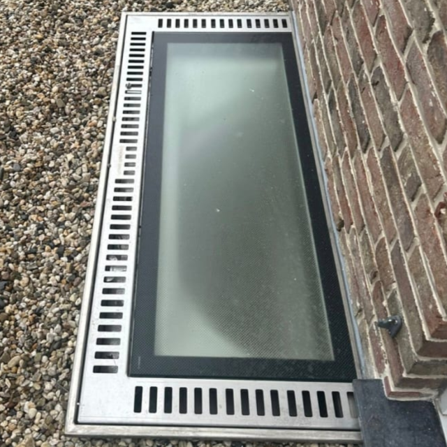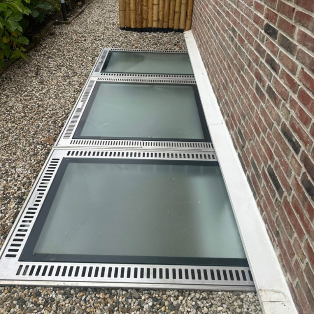 To meet all requirements, we combined three Lucernario units — one of them an openable model (1.30 x 1.30 m) and two custom-built fixed units (1.30 x 1.00 m). Together they covered the full opening, bringing natural light and ventilation into the basement while keeping out water, debris and insects.